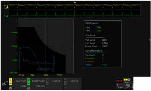 示波器的測試應(yīng)用非常簡單,使用電壓、電流探頭正常測試開關(guān)管的VDS和IDM,并打開SOA分析功能,對照數(shù)據(jù)手冊的SOA數(shù)據(jù)設(shè)置好示波器的SOA參數(shù)即可。一但波形觸碰到安全區(qū)以外的區(qū)域,就說明器件超額工作,存在危險。